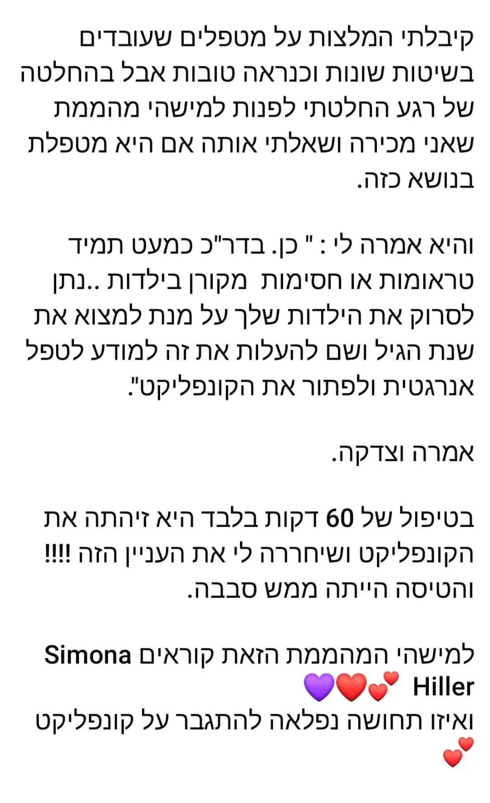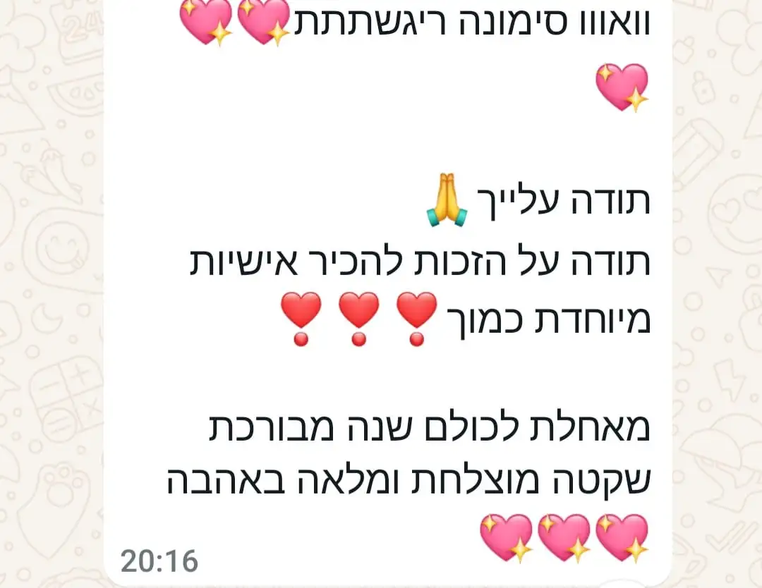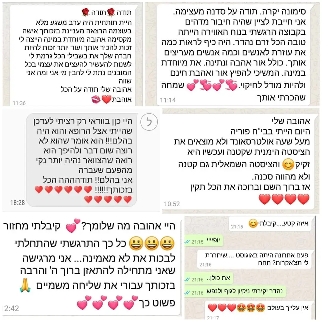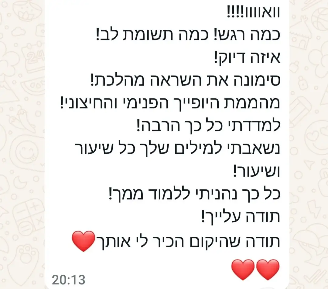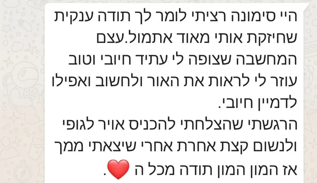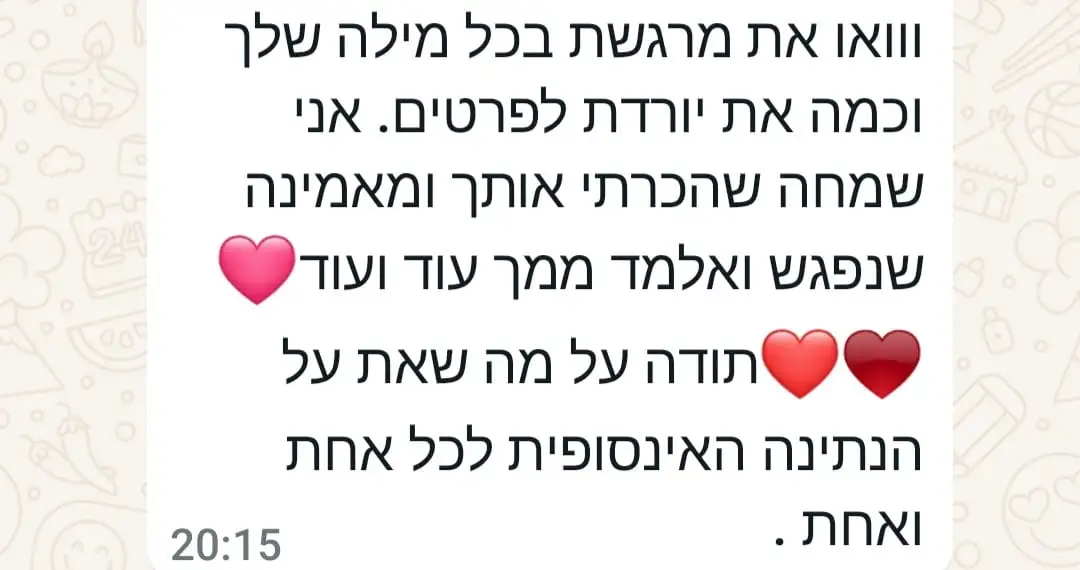 למעלה משני עשורים של עבודה כמטפלת רב-תחומית, עם מאות מטופלים שהגיעו להישגים משמעותיים בתחום הרגשי, הרוחני והפיזי.