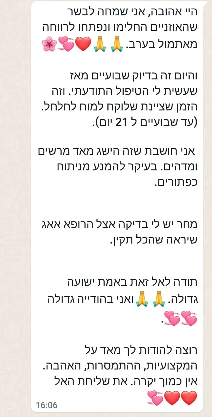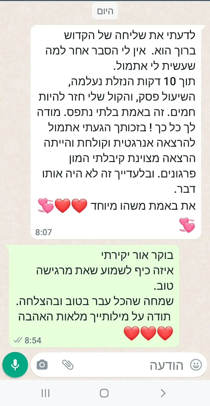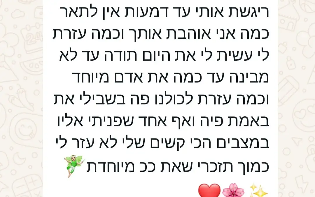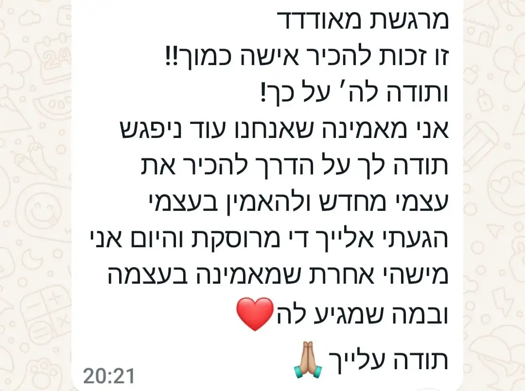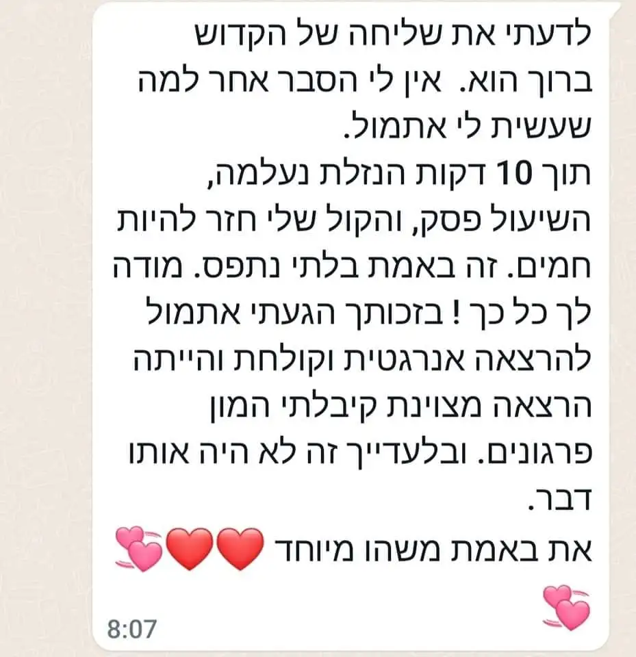 למעלה משני עשורים של עבודה כמטפלת רב-תחומית, עם מאות מטופלים שהגיעו להישגים משמעותיים בתחום הרגשי, הרוחני והפיזי.