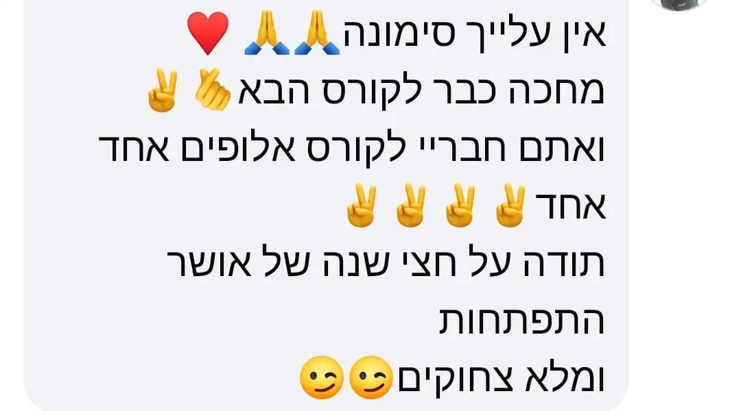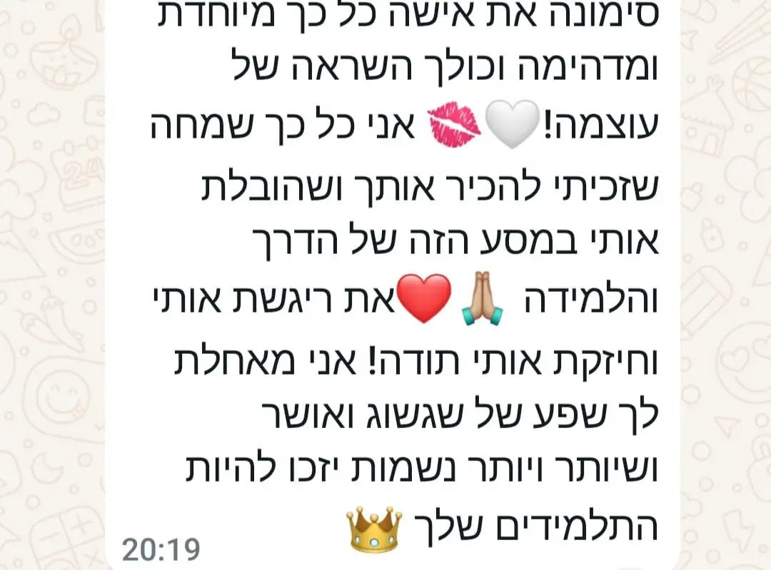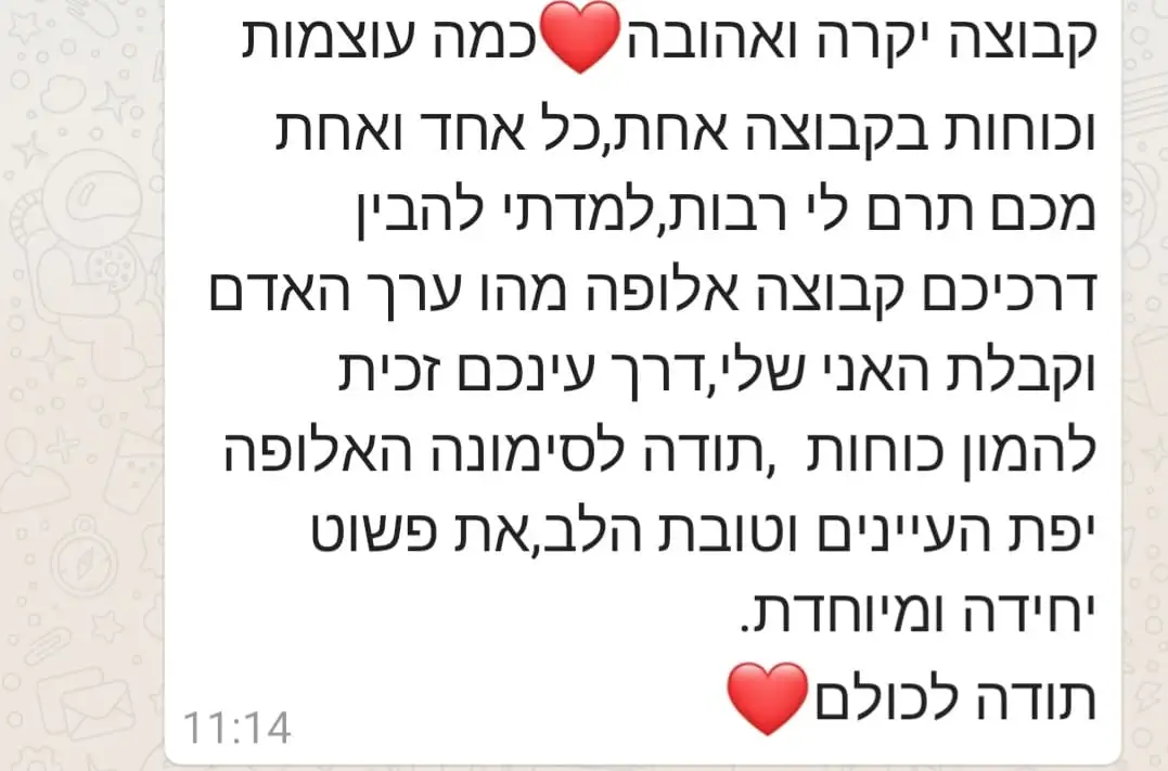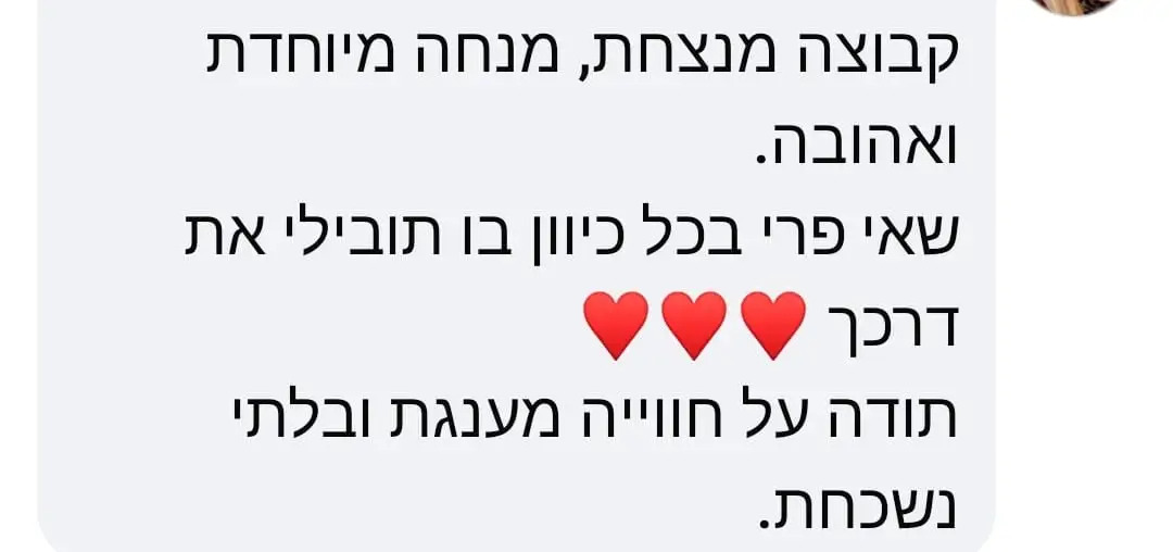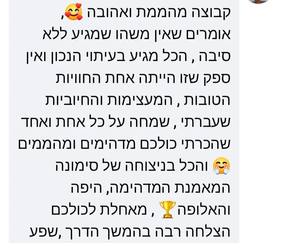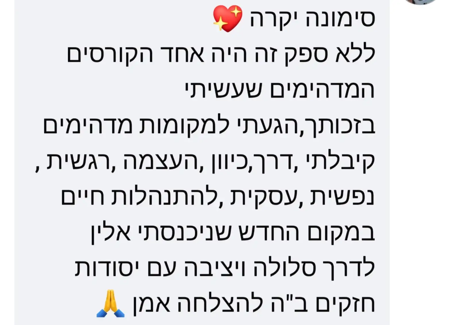 תהליך זה הוא לא רק מקצועי, אלא גם מסע של התפתחות אישית שמקנה כלים לחיים מלאים ומשמעותיים יותר. המשתתפים חווים צמיחה והגשמה בכל תחומי החיים – מהכשרה מקצועית ועד יחסים אישיים, מהגברת המודעות העצמית ועד חיזוק החוסן הפנימי.