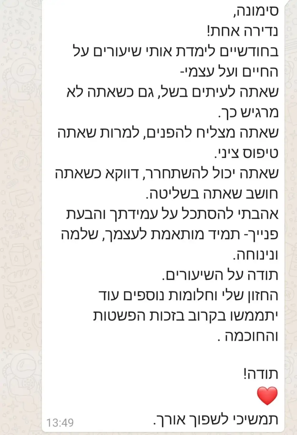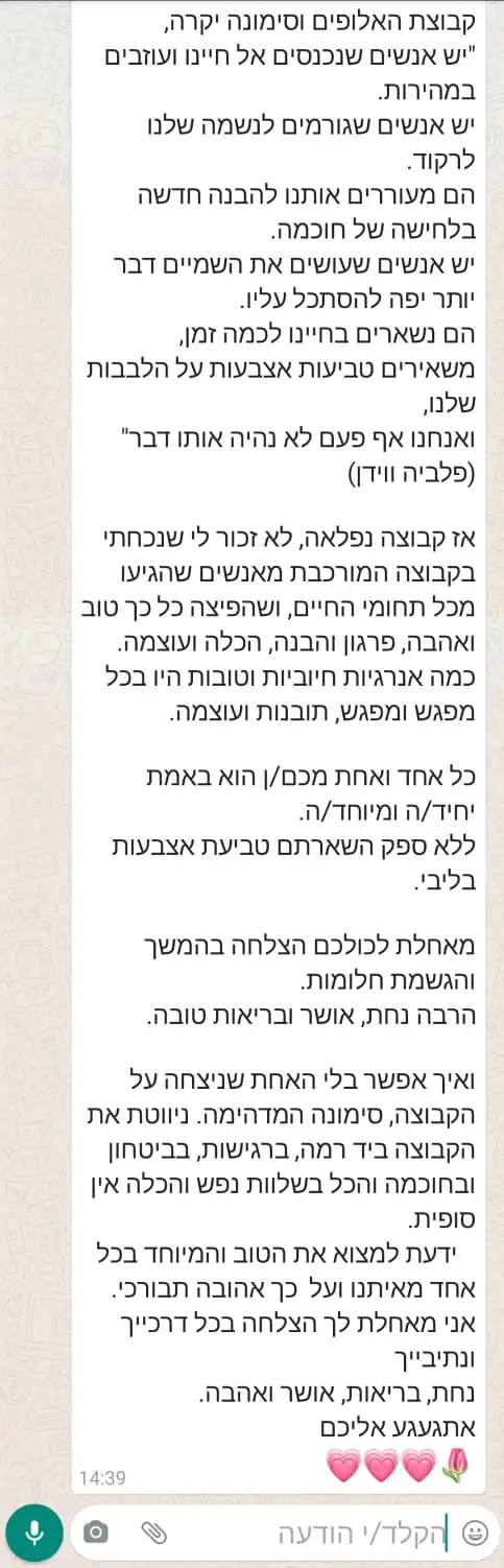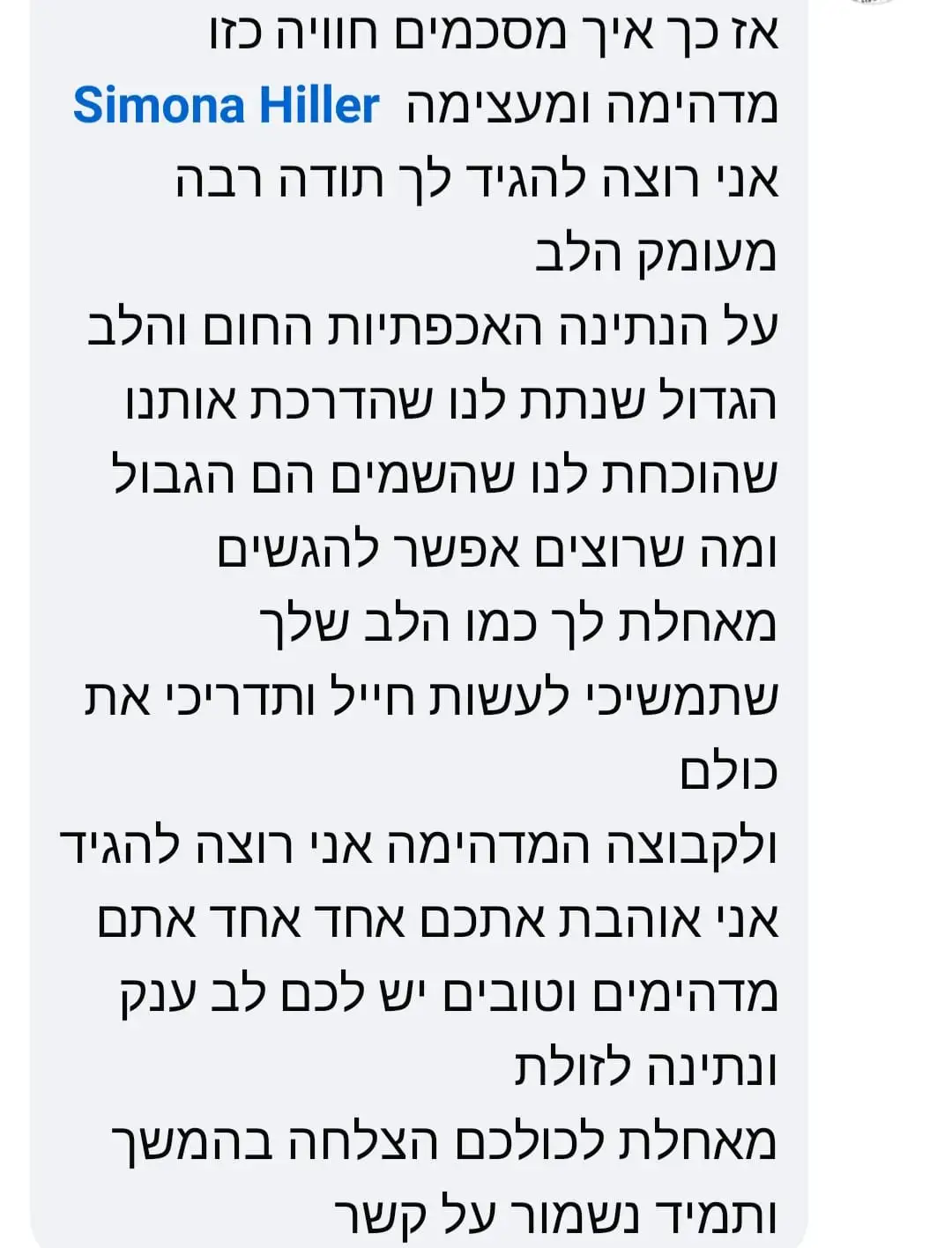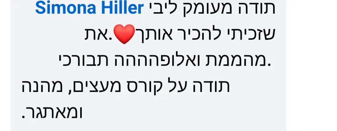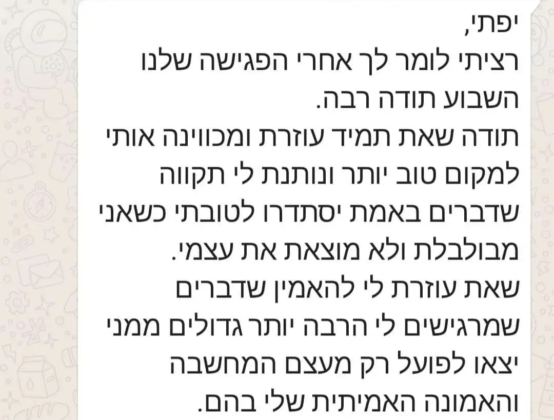 תהליך זה הוא לא רק מקצועי, אלא גם מסע של התפתחות אישית שמקנה כלים לחיים מלאים ומשמעותיים יותר. המשתתפים חווים צמיחה והגשמה בכל תחומי החיים – מהכשרה מקצועית ועד יחסים אישיים, מהגברת המודעות העצמית ועד חיזוק החוסן הפנימי.